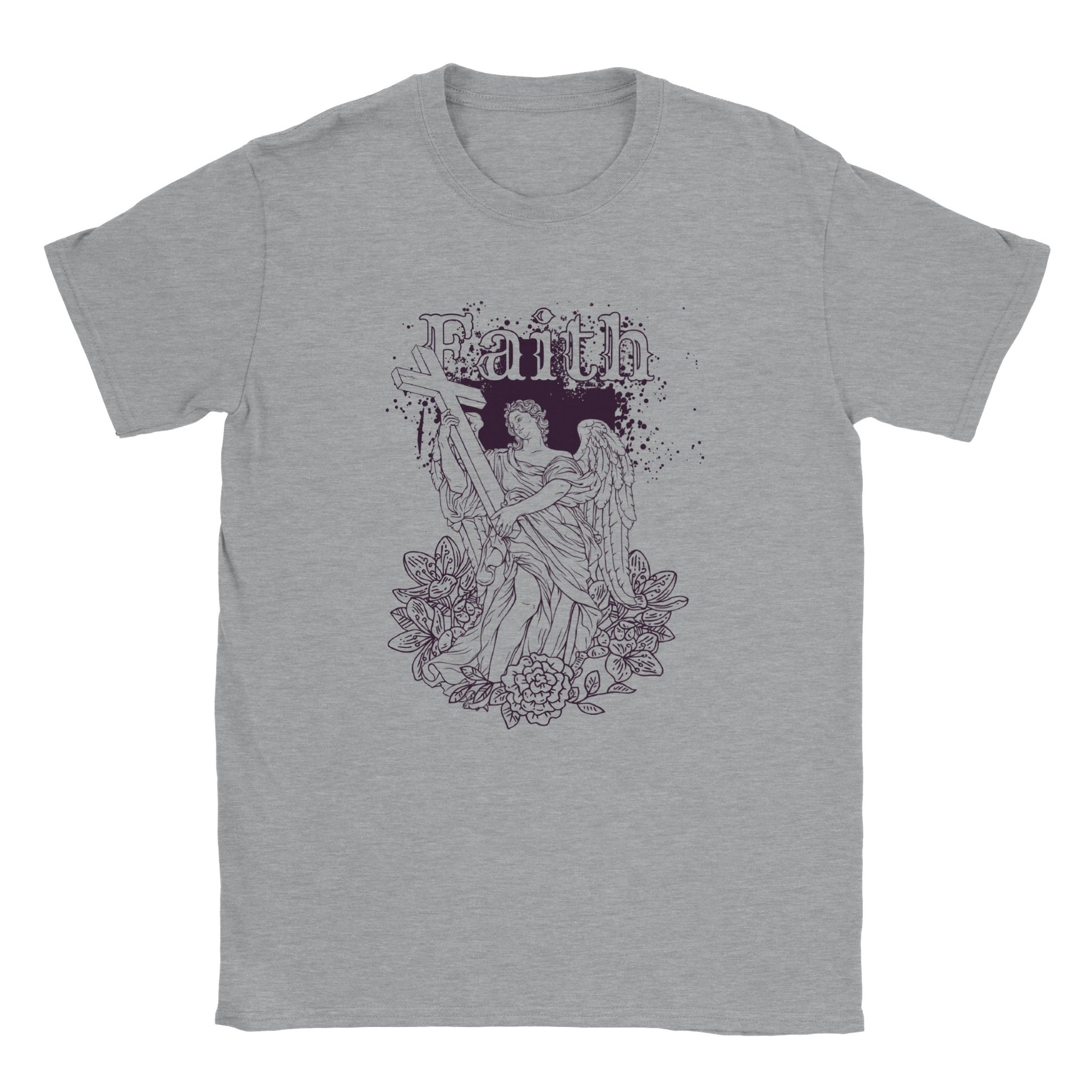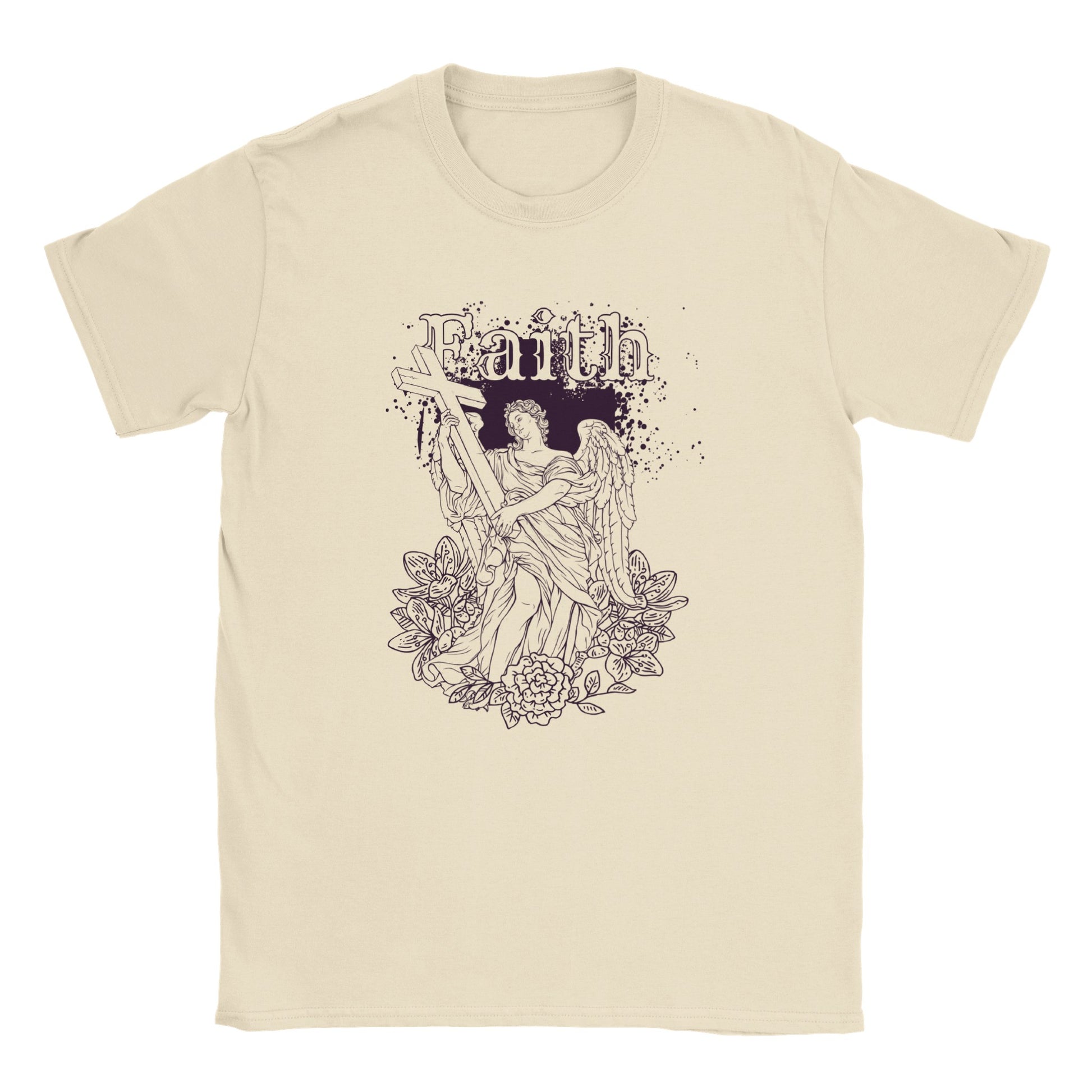An iconic image of an angel holding a cross. A classic unisex t-shirt that works well with any outfit. Made of a heavier cotton with a double-stitched neckline and sleeves.