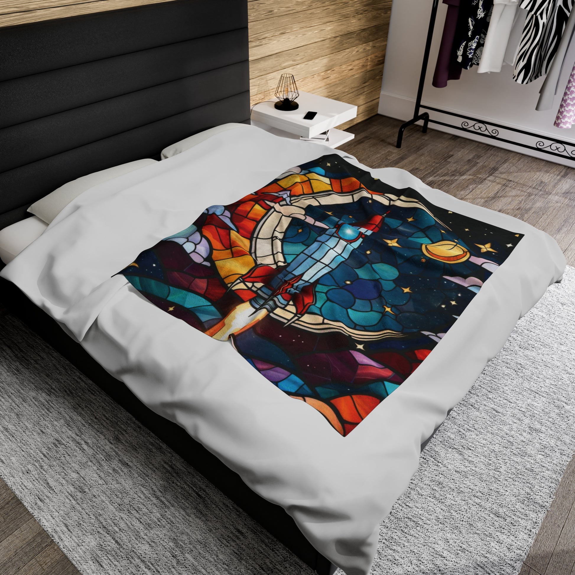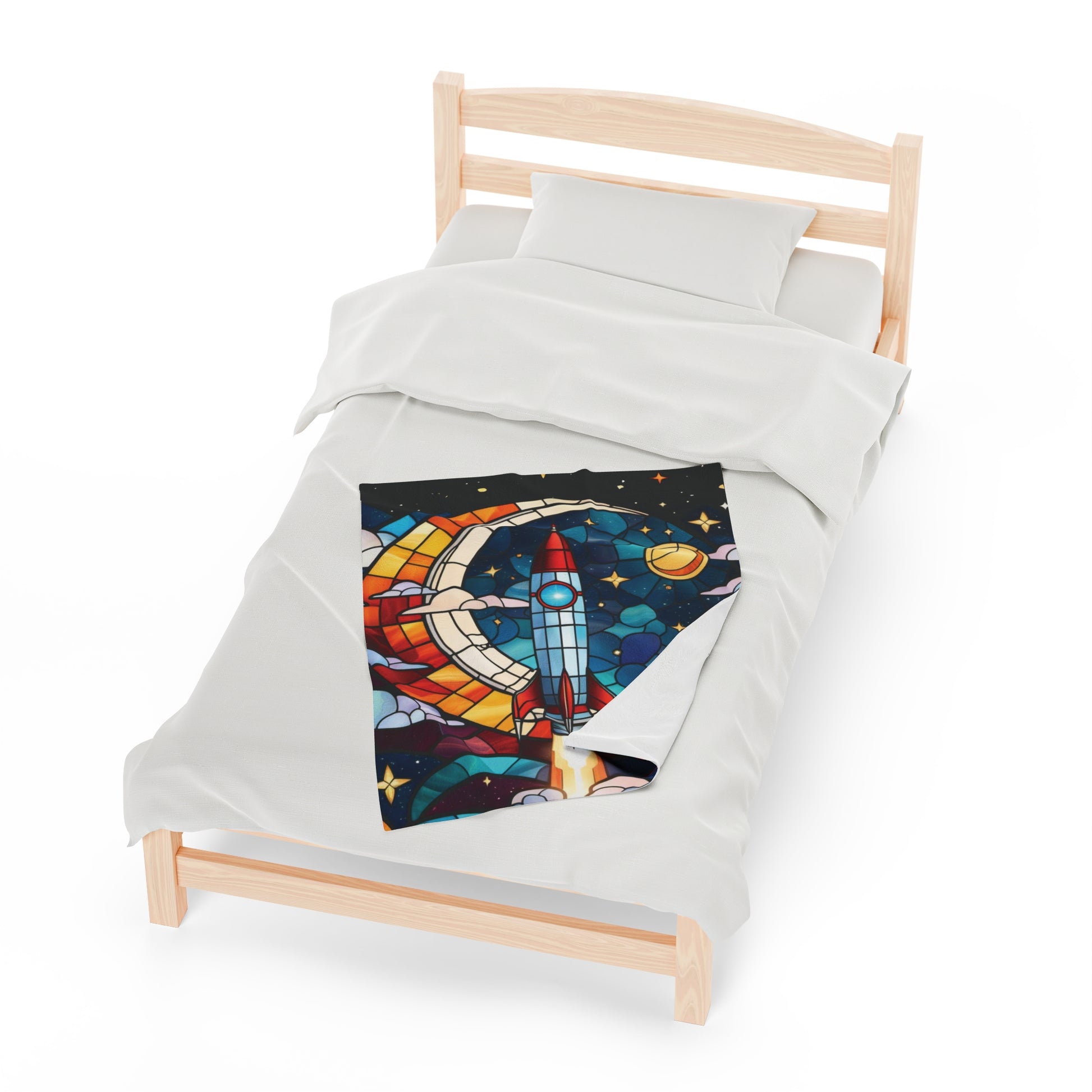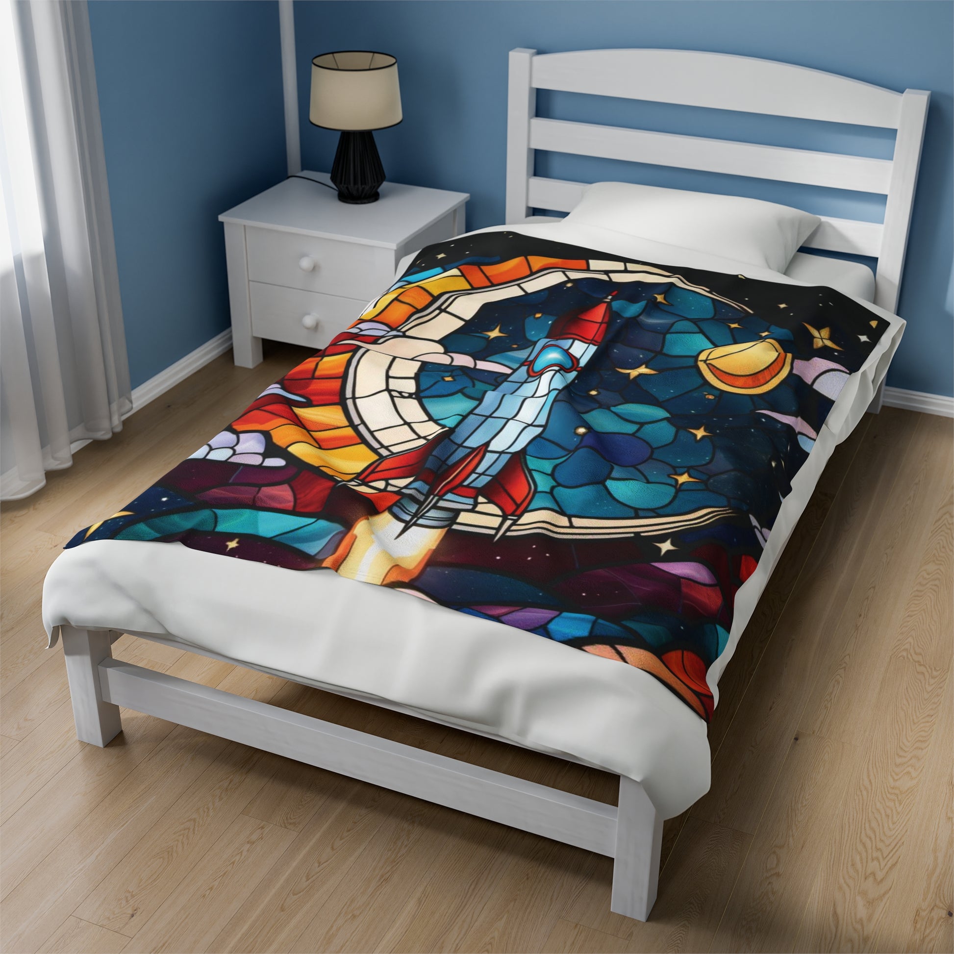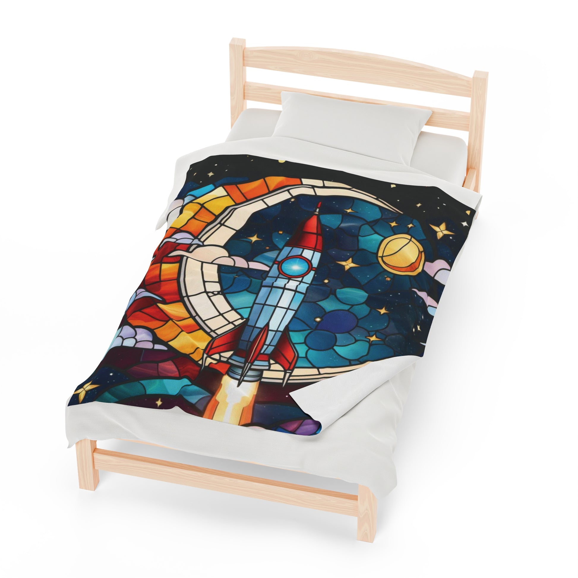 Out of This World Velveteen Plush Blanket - Stained Glass Rocket scene