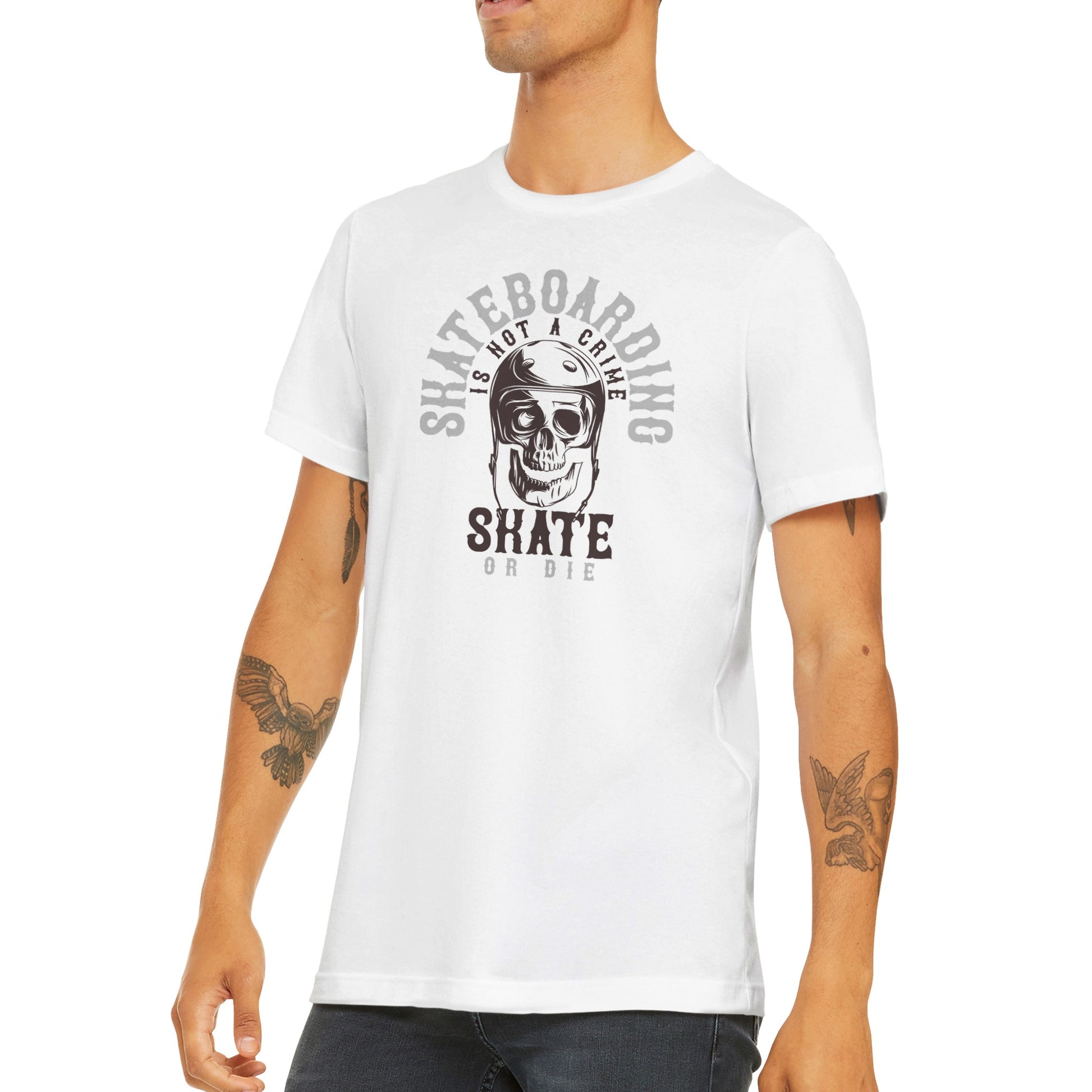 You can let everyone know that skateboarding is not a crime when you wear this graphic T. Either at the park or just cruising the streets, this shirt will make a statement. Add one of these to your collection or give one to your skate buddies. A classic unisex t-shirt that works well with any outfit. Made of a heavier cotton with a double-stitched neckline and sleeves.