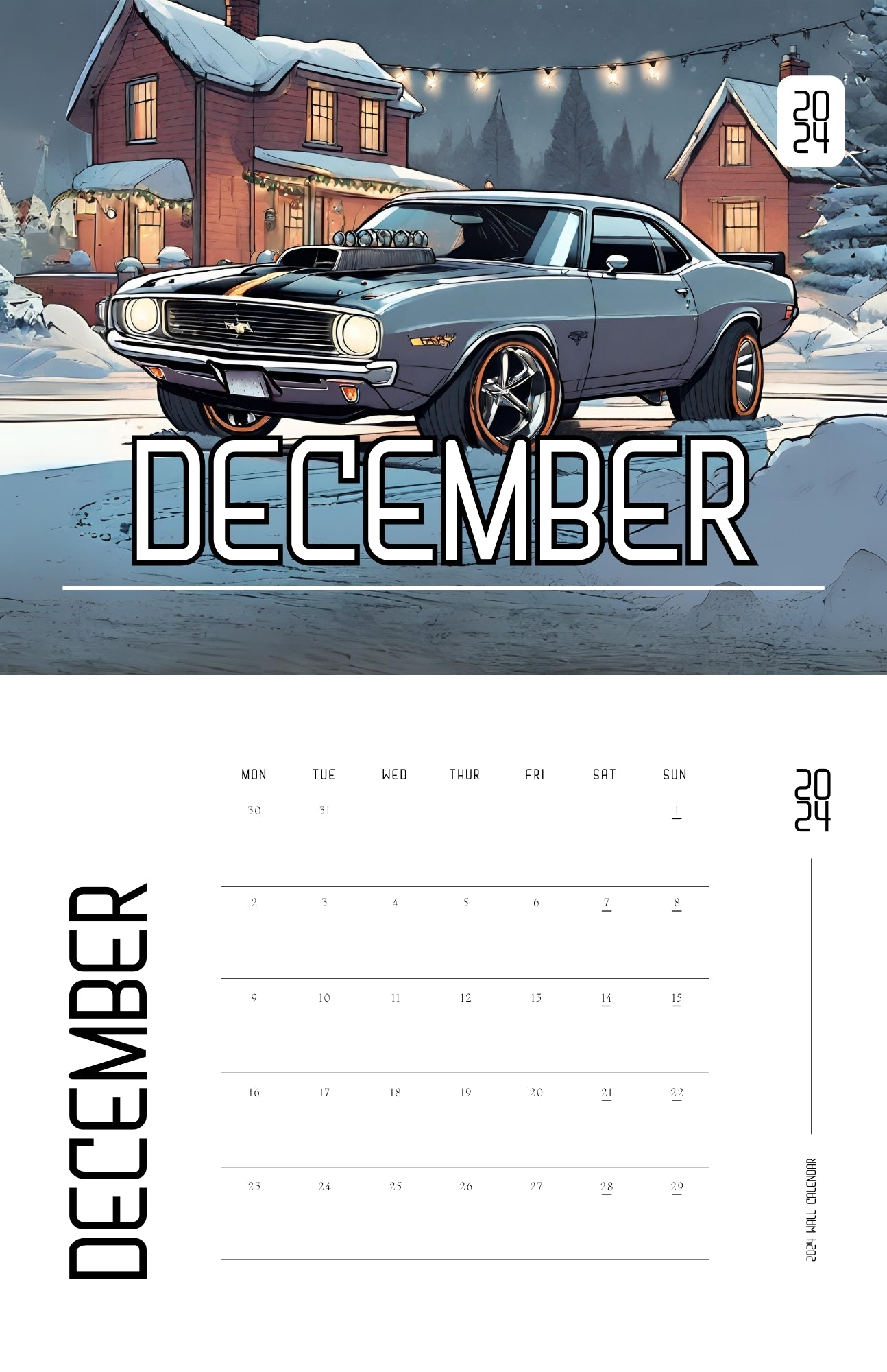 2024 Muscle Car Calendar with original concept art for each month. It has colorful images with a special muscle car for each page. These are original and not from anywhere else. If you love cars and want to hang up a stylish calendar, this is for you. If you need a special gift for that had to buy for person who likes cars, this might be the gift for them.